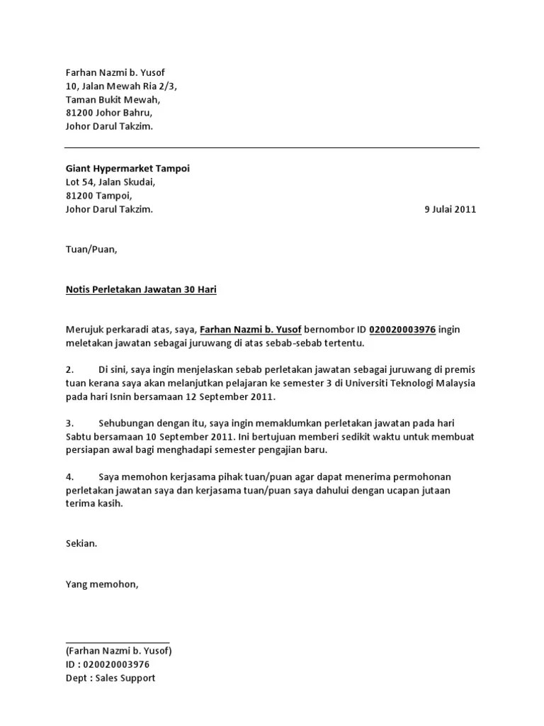 Contoh Surat Berhenti Kerja Notis Sebulan Sebab Sambung Belajar : 1. Contoh surat berhenti kerja sebab dapat kerja baru bahasa inggeris · contoh surat berhenti kerja serta merta notis 24 jam dan otosection · contoh . Banyak memberi tunjuk ajar dan kepercayaan kepada saya ketika melaksanakan kerja. Saya juga begitu gembira selama saya berkhidmat dengan syarikat tuan. Semasa zaman menjadi mahasiswa, saya selalu bekerja apabila cuti semester yang panjang. Tarikh pengurus nama syarikat alamat syarikat tuan puan notis berhenti kerja di nama syarikat. Contoh surat berhenti notis sebulan contoh surat perletakan jawatan notis sebulan.